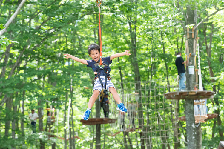 標高1,200mのブナ林の中に本格アスレチックが登場! 心地よい木漏れ日が降り注ぐブナ林の中に高さ最大9.8mの天空のアスレチックで冒険しよう!