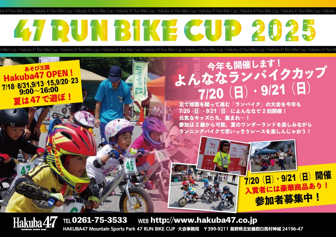ペダルなしの足で蹴って進むランニングバイク。代表されるBIKEにSTRIDER(ストライダーがあるのは皆さんもうご存じ?!自然とバランス感覚を向上する乗り物として今注目のアイテムです。そんなランニングバイクのレースをHakuba47で開催します! 2歳~9歳のお子さまが参加できるレースです。夏のワンダーランド "あそび王国 よんなな" を楽しみながらランニングバイクで思いっきりレースを楽しんじゃおう!