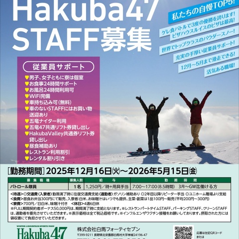 2025-20256 冬期STAFF募集 Hakuba47では2025-2026ウィンターシーズンに...