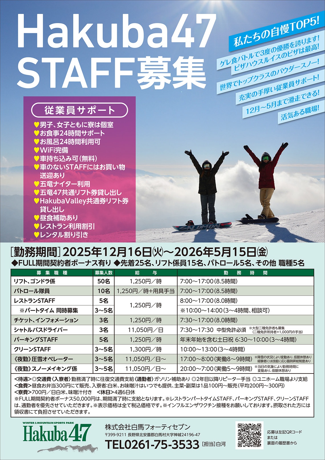Hakuba47では2025-2026ウィンターシーズンに一緒に働いてくれるスタッフを募集しています。 私たちと一緒に思い出に残るシーズンを過ごしませんか?
